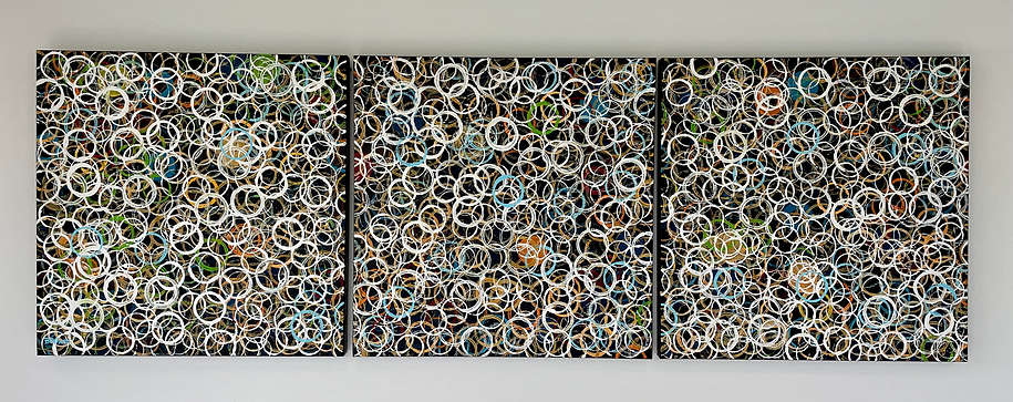 In enkele recente versies zoals Autumn Outdoor Party voeg ik nog een extra verhaal toe... De ringen kunnen hier ook een voorstelling zijn van wie met wie in contact treedt op een feestje, wie is luid of heeft veel te vertellen (dikke lagen verf), wie is stil, verfijnt, wie staat bij wie, wie hoort bij elkaar (zelfde kleuren).
